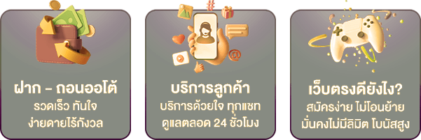 ตอบ : - ได้รับใบอนุญาตจาก Curacao E-Gaming - มีประสบการณ์ให้บริการมากกว่า 5 ปี - ระบบฝาก-ถอนอัตโนมัติรวดเร็วภายใน 30 วินาที
